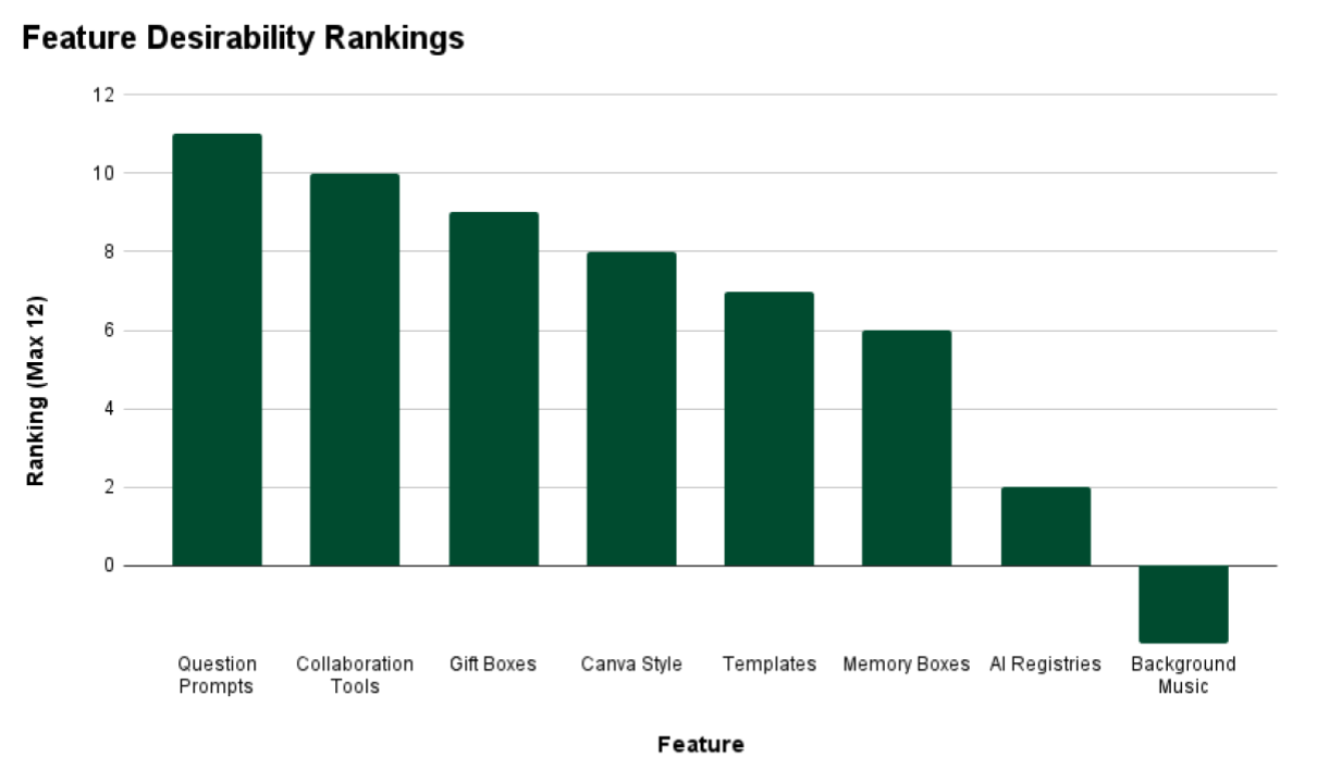 To better understand our users and their needs we conducted a remote survey. We sourced 12 participants and sent them a variety of questions ranging from more broad requests for examples of celebration experiences to more detailed opinions on the specific features we could potentially include in our prototype.