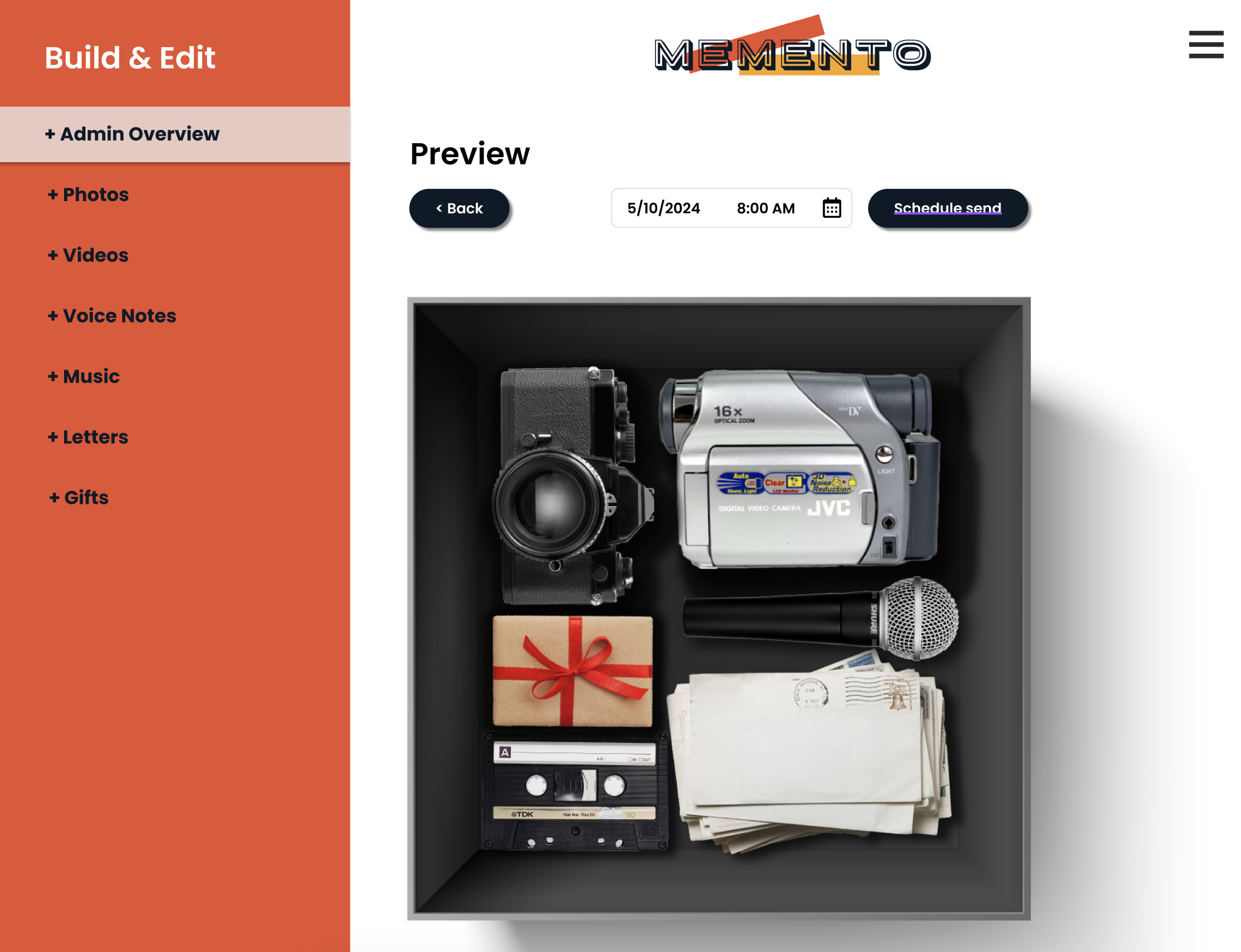 For clarity and ease of use, all editing pages are divided out according to the individual functions and asset uploads the user will need to access when building their Memento Box.